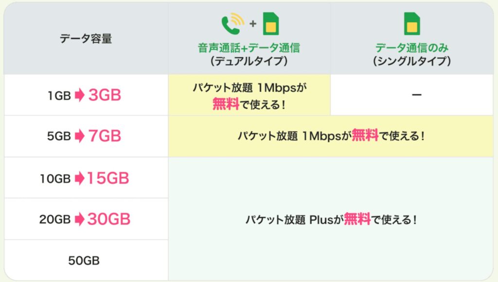 回線料金の設定はそのままに、50GB以外の各データ容量を増量。特に1GBのプランが3GBに増量されたのが一番インパクトがデカい。