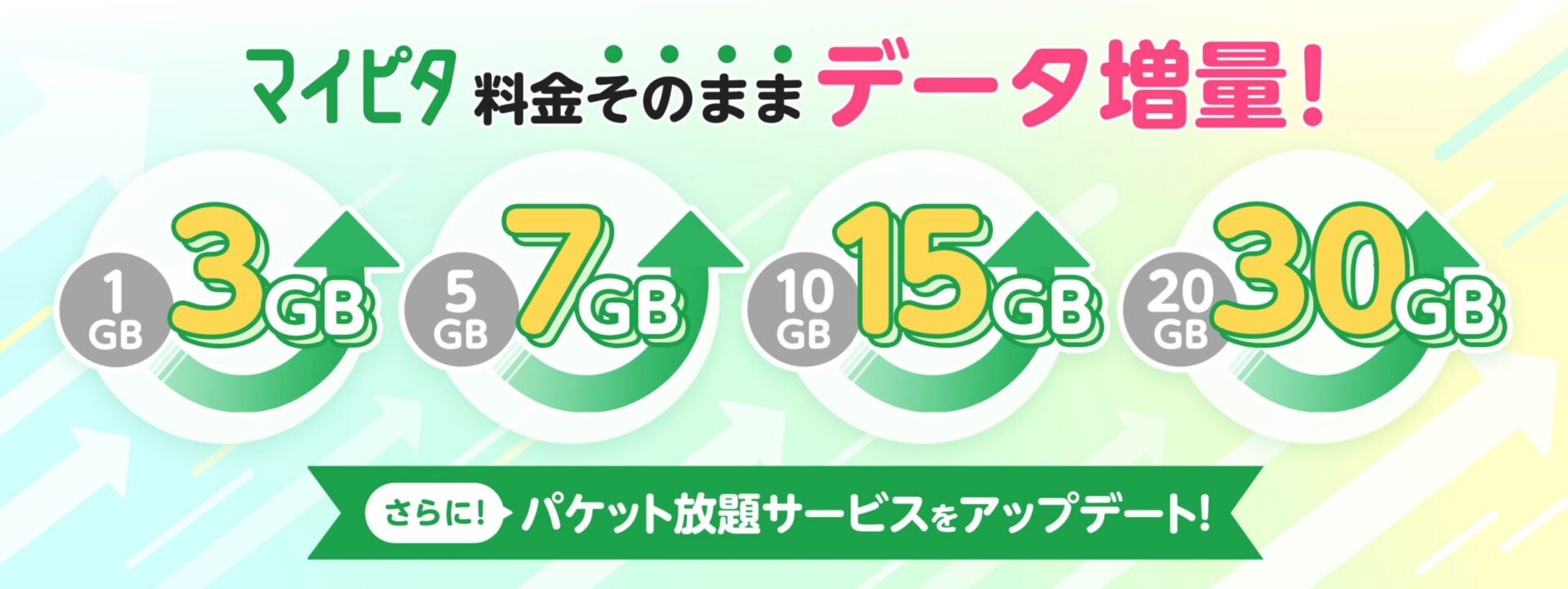 そして今回アップデートされたパケット放題プラス。既存のユーザーであればデメリットなくデータ使い放題の速度が3Mbpsに向上。更にマイピタの基本データ量も増量されて、かなりお得になったように見える。