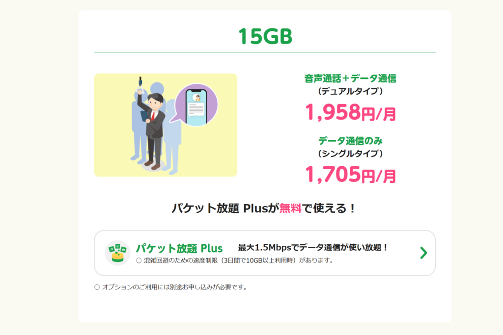 15GBというちょうどいいデータ容量に加えて、やはり通信速度3Mbpsの「パケット放題プラス」が無料で使える点が大きい。