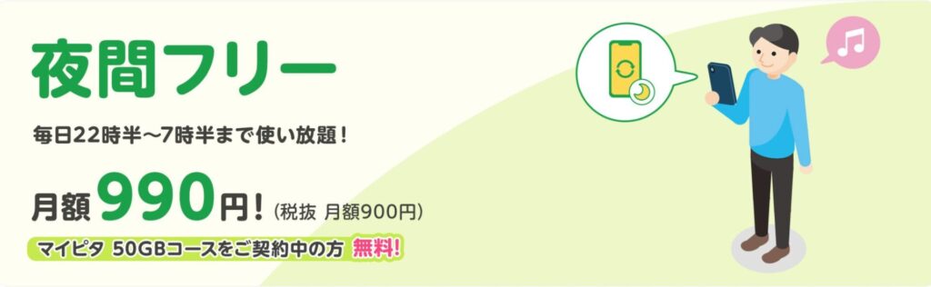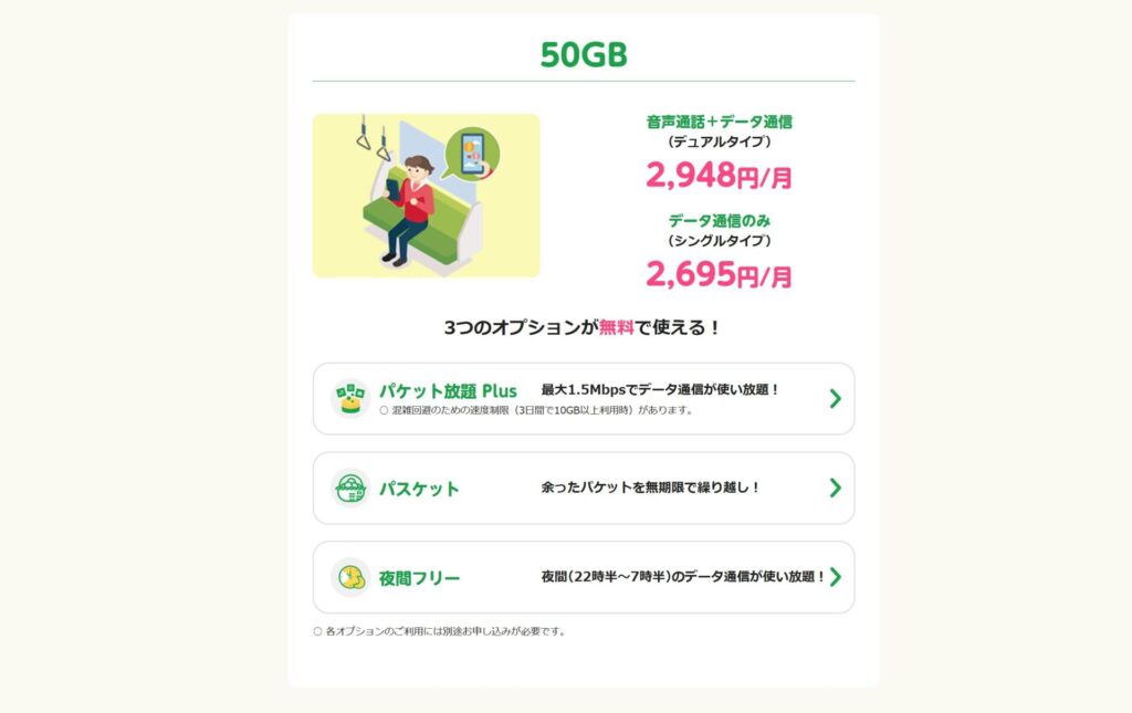 また、50GBプランは「パケット放題プラス」と「夜間フリー」が無料で付いてくる点も魅力。