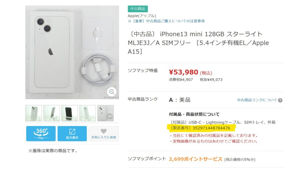 また、実店舗の場合はスマホの状態が詳しく記載されている。赤ロムかどうか、バッテリー残量が何%あるのかといった重要な指標も確認することができるのもメリットだ。