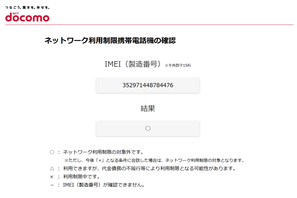 判定が「〇」であれば利用制限なし。「△」は残債等あり。「×」は利用制限中。「△」判定も普通に販売されているが、そのうち使えなくなる可能性が高いので、安さに惹かれて手を出してはいけない。