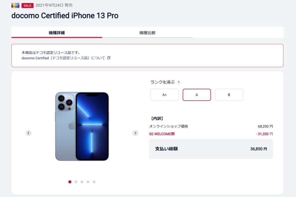 例えば、iPhone13Proの認定中古品(ランクA・美品)の場合、定価68,200円から3万円以上の値引きがされて、一括36,850円で購入することができる。