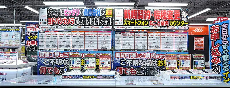 オンラインでスマホを買うのがいいのがお得なのはわかった。でもやっぱり自分でスマホを買うのは不安だ。誰かに教えてもらいながら購入したい。そんなあなたにおすすめなのが、家電量販店の携帯コーナーだ。