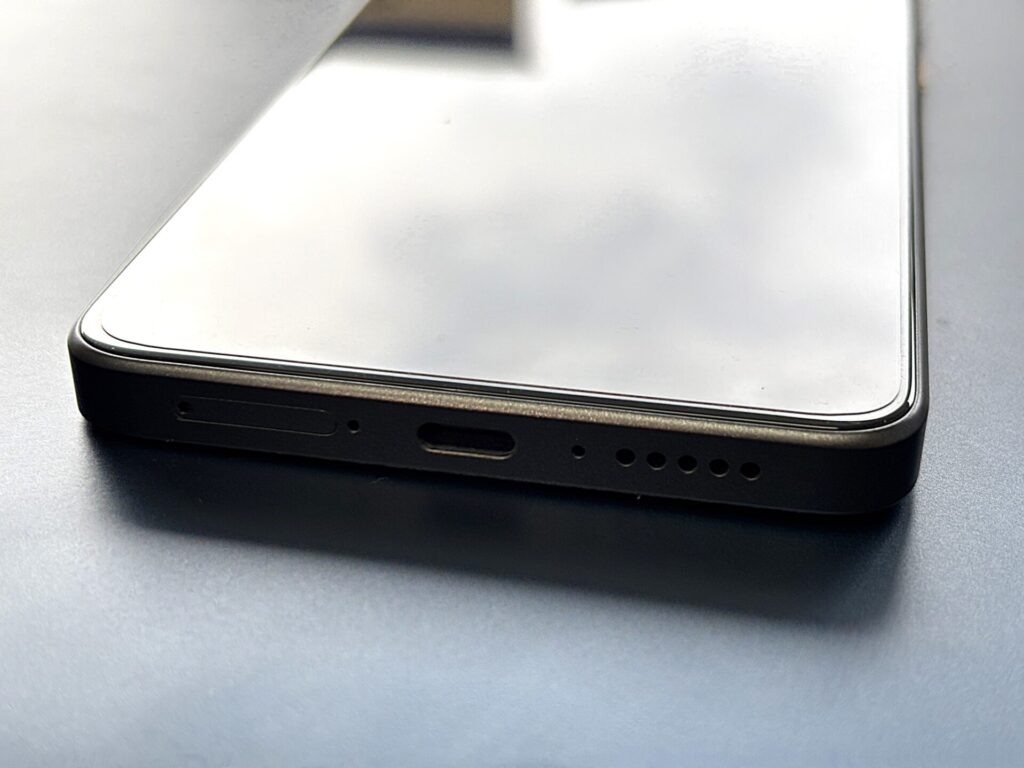 本体下部にUSBタイプ C 端子とSIMスロット。ちなみにPOCO X7ProはeSIMに非対応だが、物理SIM(nanoSIM)二枚刺しが可能。SIMトレイの表裏に1枚ずつ装着する仕様になっており、デュアルSIMでの運用が可能。