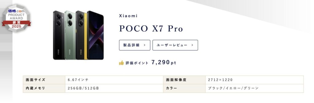 POCO X7Proは、みんな大好き価格ドットコムが年に1回開催している「価格.comプロダクトアワード」の2025年スマートフォン部門銀賞を受賞している実力機だ。