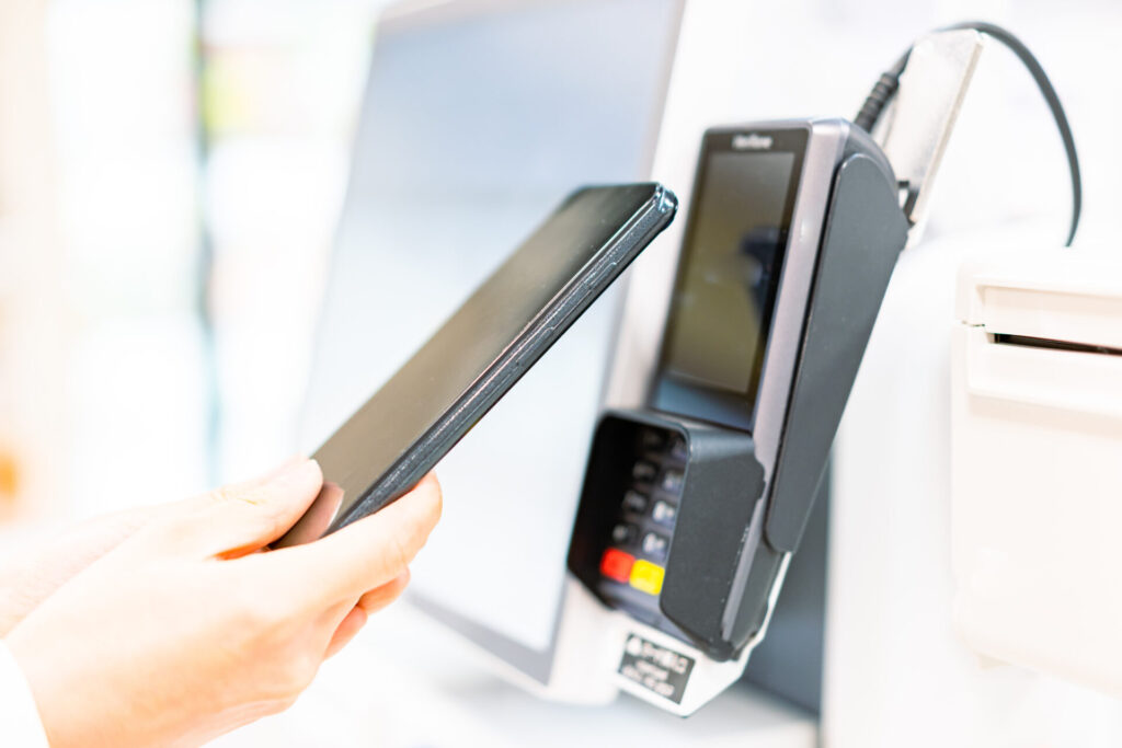 スマホやカードを専用端末に「かざすだけ」で通信できる、10cm程度の近距離無線通信技術。