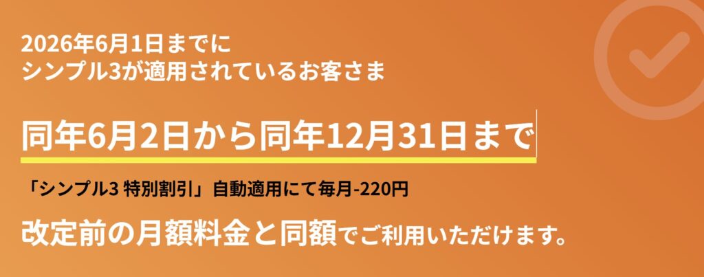実はワイモバイルは2026年6月から料金プランを値上げする予定。値上げ幅はシンプル3各プラン共通で220円。