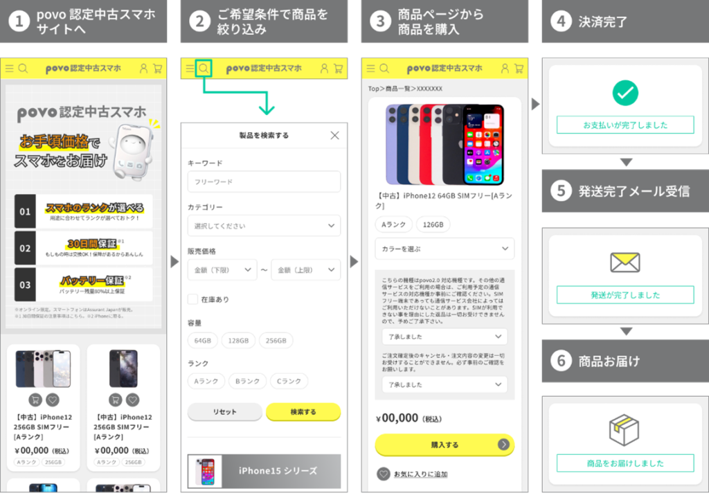 昨今のスマホ高機能化・価格上昇に伴う中古端末への需要の高まりを受け、厳しい検査基準をクリアした中古スマートフォンをpovo利用者向けに販売するサービス。