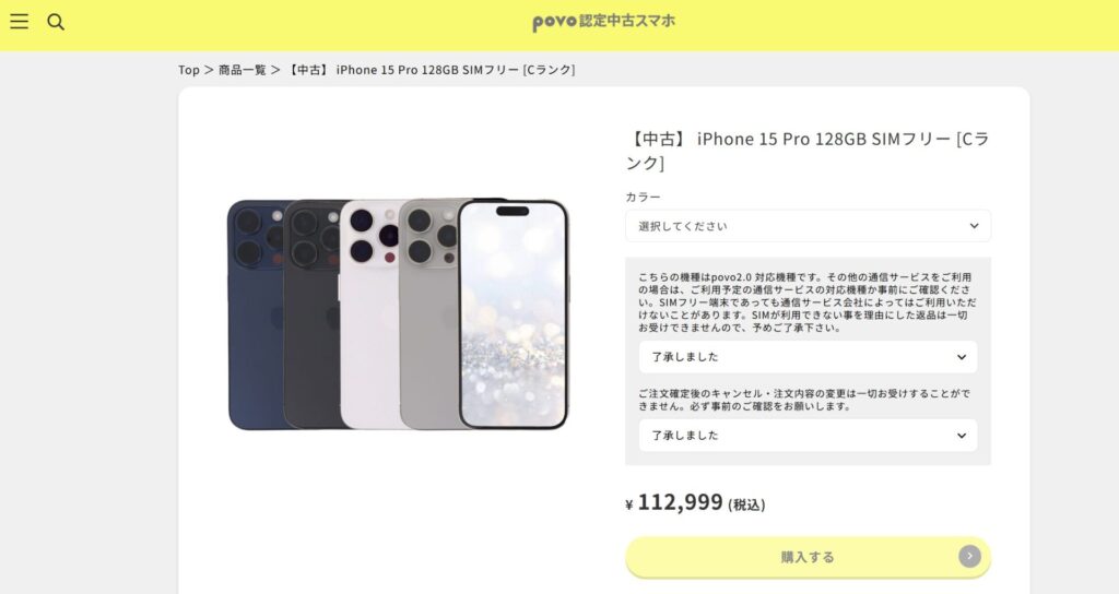 まず初めのデメリットだが、そもそもpovo認定中古品のスマホは安くはない。例えば、iPhone15Proの128GBモデル。povo認定中古品だと112,999円。まぁまぁ高い。