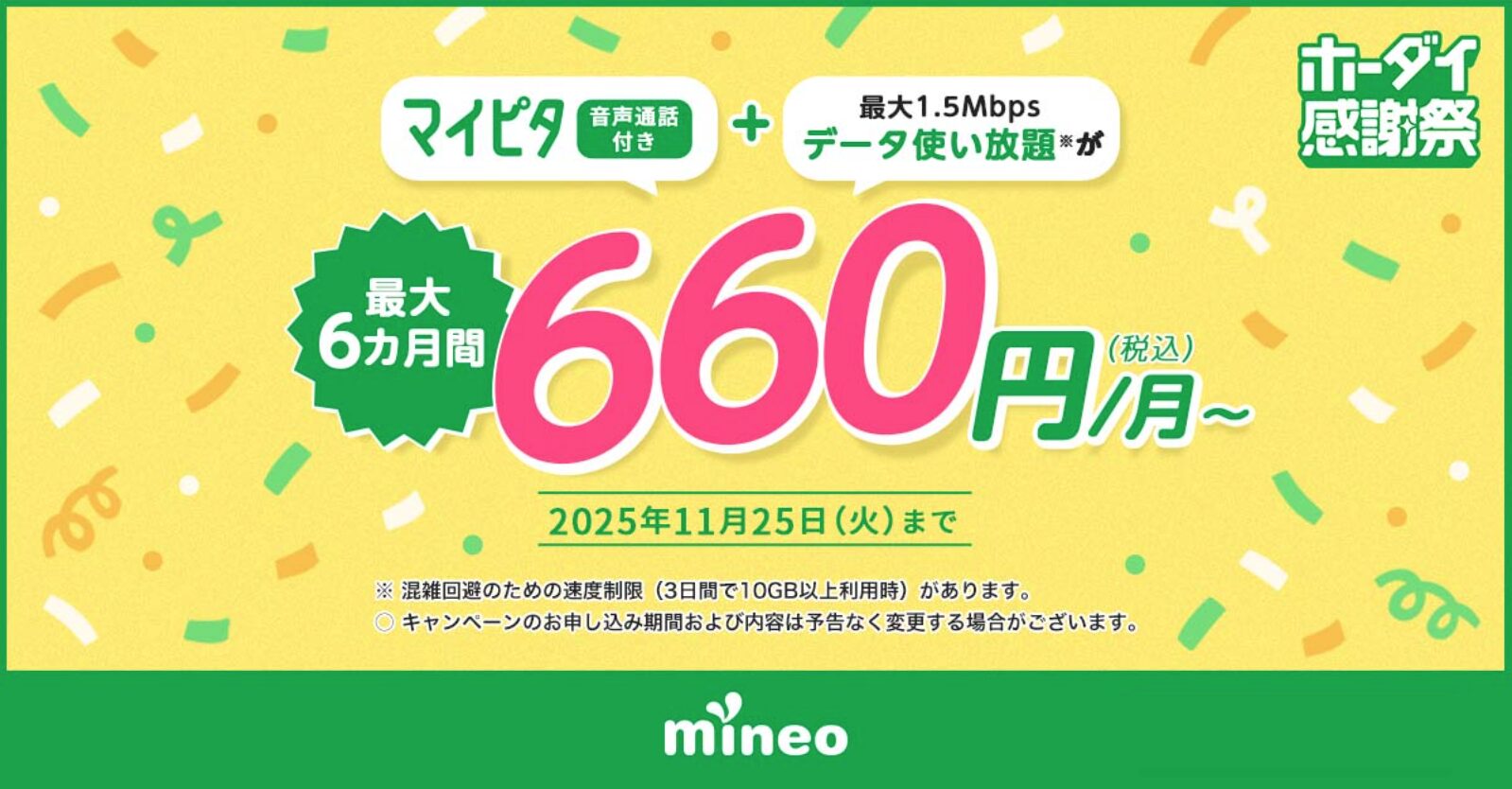 群雄割拠、有象無象のキャリアがはびこる通信キャリア。その中でも面白い料金プランやサービスを打ち出し、独自色を出しているのが「mineo(マイネオ)」だ。 「マイネオ」の特徴は何といっても、データ使い放題プランの「マイそく」や、月額395円でデータ使い放題になる「パケット放題プラス」だろう。 今回はそんな格安SIM「mineo」について詳しく解説をしていく。 この記事のポイント マイネオの料金プラン マイネオの面白いサービス 他社の料金プランとの比較 マイネオがおすすめな人 ホーダイ感謝祭で月額660円 こ ...